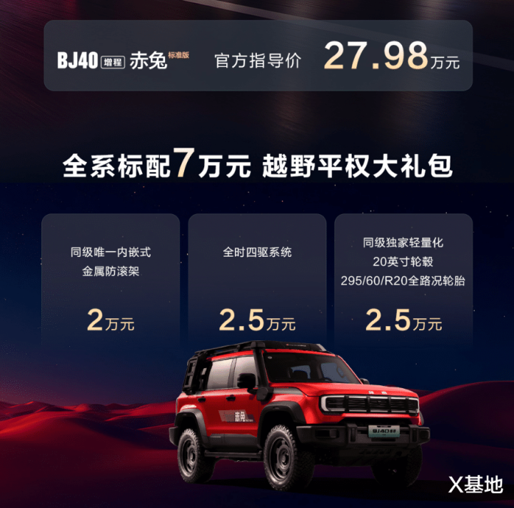 BJ40增程赤兔标准版官方指导价27.98万元!购车即可享有价值7万元的“越野平权大礼包”,包含价值2万元的同级唯一内嵌式金属防滚架、价值2.5万元的全时四驱系统和价值2.5万元的同级唯一轻量化20英寸轮毂与295/60 R20全路况轮胎。
