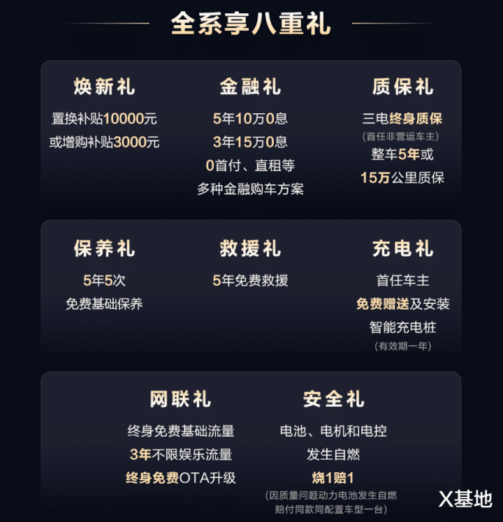 第八重,安全礼:电池、电机和电控发生自燃,烧1赔1(因质量问题动力电池发生自燃赔付同款同配置车型一台)。