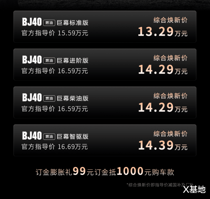 北京越野BJ40燃油巨幕版官方指导价15.59—16.69万元,综合焕新价低至13.29万元。北京越野送上订金膨胀礼:1月27日下订,即可享受“99元订金抵1000元购车款”优惠政策。